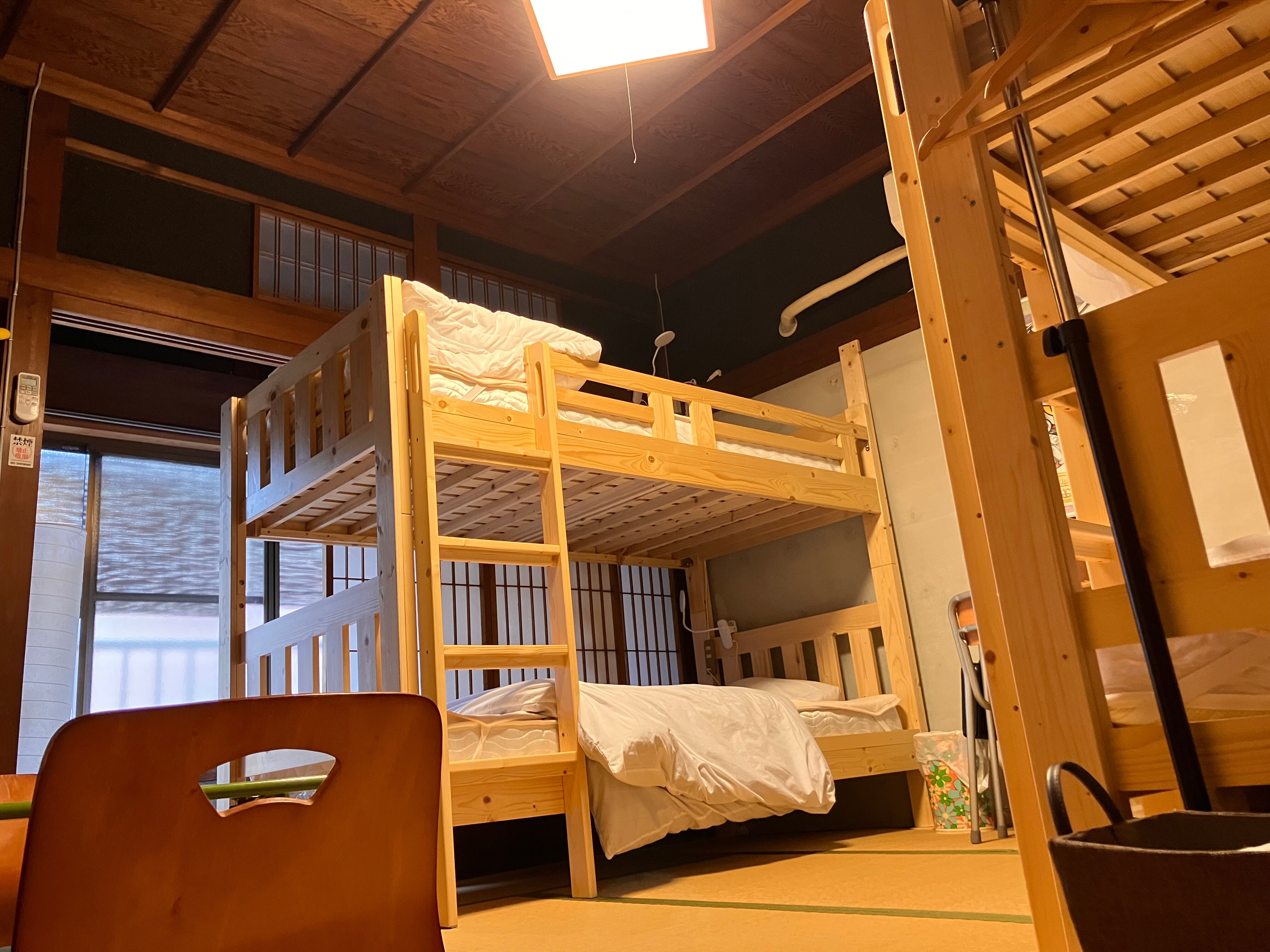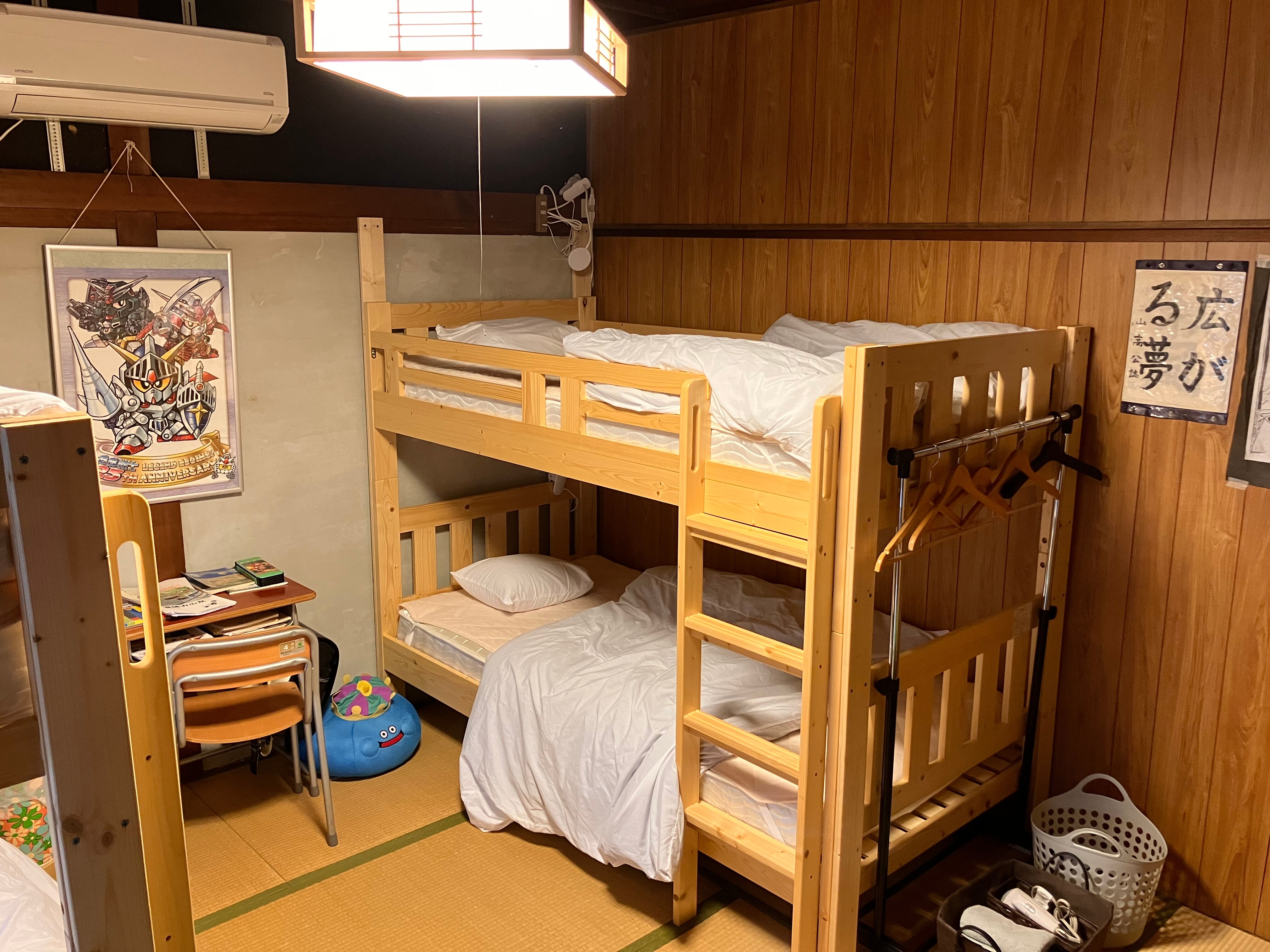 可使用古民家内的和室方案。 本宿是一家与商务酒店或旅馆稍有不同的独特住宿。 可以尽情享受当下话题的“昭和复古”! 方案的介绍 卧室为单间(和室)。 厨房、休息室、电视房、厕所和淋浴室为共享空间。 请顾客之间互相注意避免造成困扰。 如需包场,请从包场方案进行预约。 推荐亮点 ①便利店、居酒屋、渔具店、超市、投币洗衣店等步行范围内非常方便。 ②对于红白机时代、超级任天堂时代的人来说,满载怀旧游戏(^^ 宿舍介绍 ・提供免费Wi−Fi ・提供毛巾、洗发水、护发素、沐浴露等洗浴用品 ・免费洗衣机(含洗衣液),适合长期入住 ・可自行做饭!餐具和烹饪器具等也都齐全。 ・提供免费租赁自行车,方便短途散步或去超市购物。 限2辆 ・市内也有提供外卖和打包服务的店铺。 也可咨询我们协助下单 入住时间 15:00〜21:00 如需在上述时间外办理入住,请提前联系我们 前往住宿地点的交通方式 ・电车:从熊野市站步行约7分钟 ・汽车:从熊野尾鹫道路“熊野大泊IC”下车约3分钟 如有疑问,请随时与我们联系 条件与注意事项 ・共有淋浴间可用,但没有浴缸 ・请提前咨询关于入住及退房前后的行李寄存事宜 ・馆内为禁烟区域,请使用馆外指定的吸烟区 ・如需使用停车场,请务必提前联系