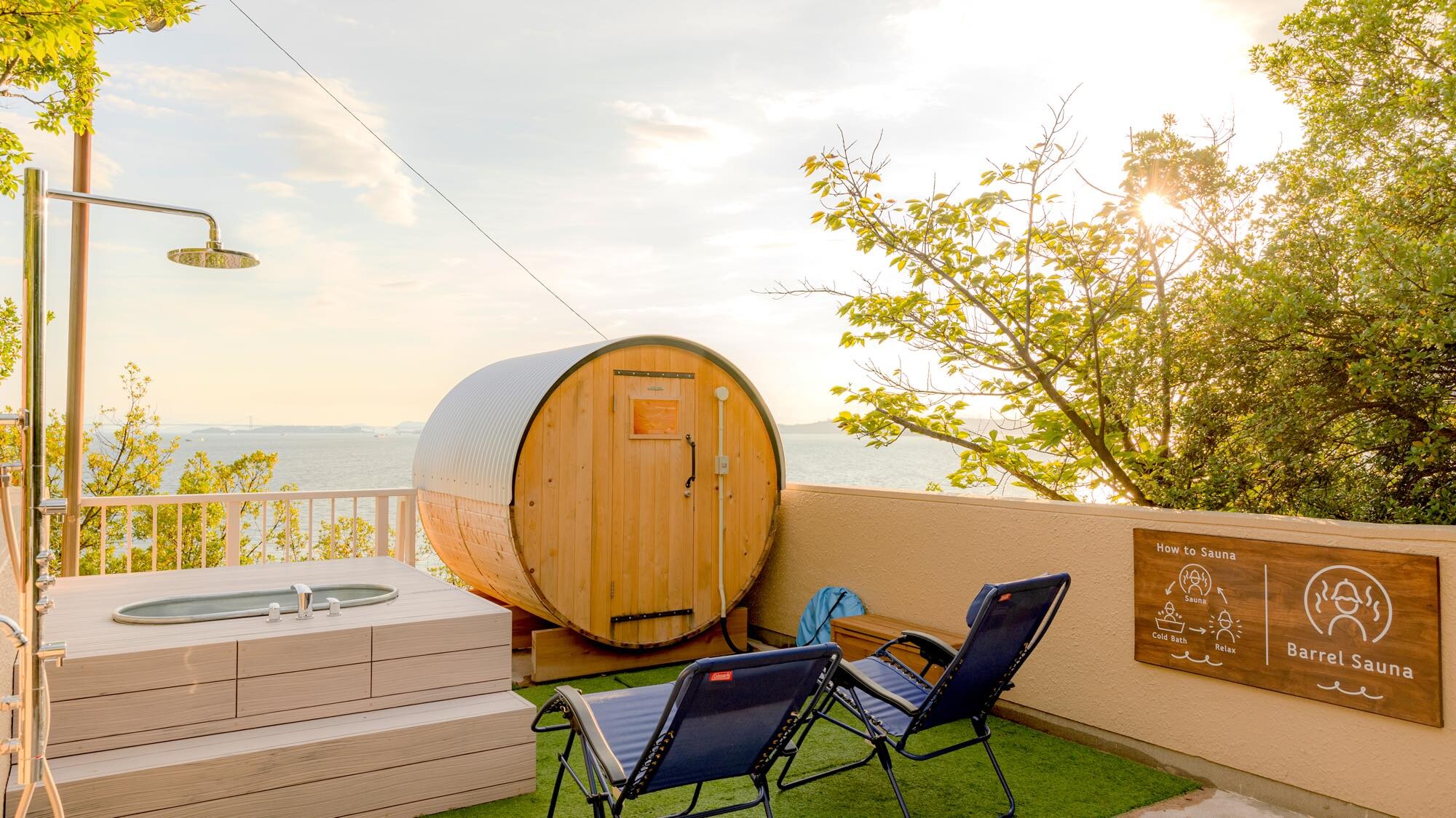 Enjoy stunning views of the Seto Inland Sea from this exclusive glamping site with only eight rooms. Indulge in a luxurious experience with a glass-walled barrel sauna.
